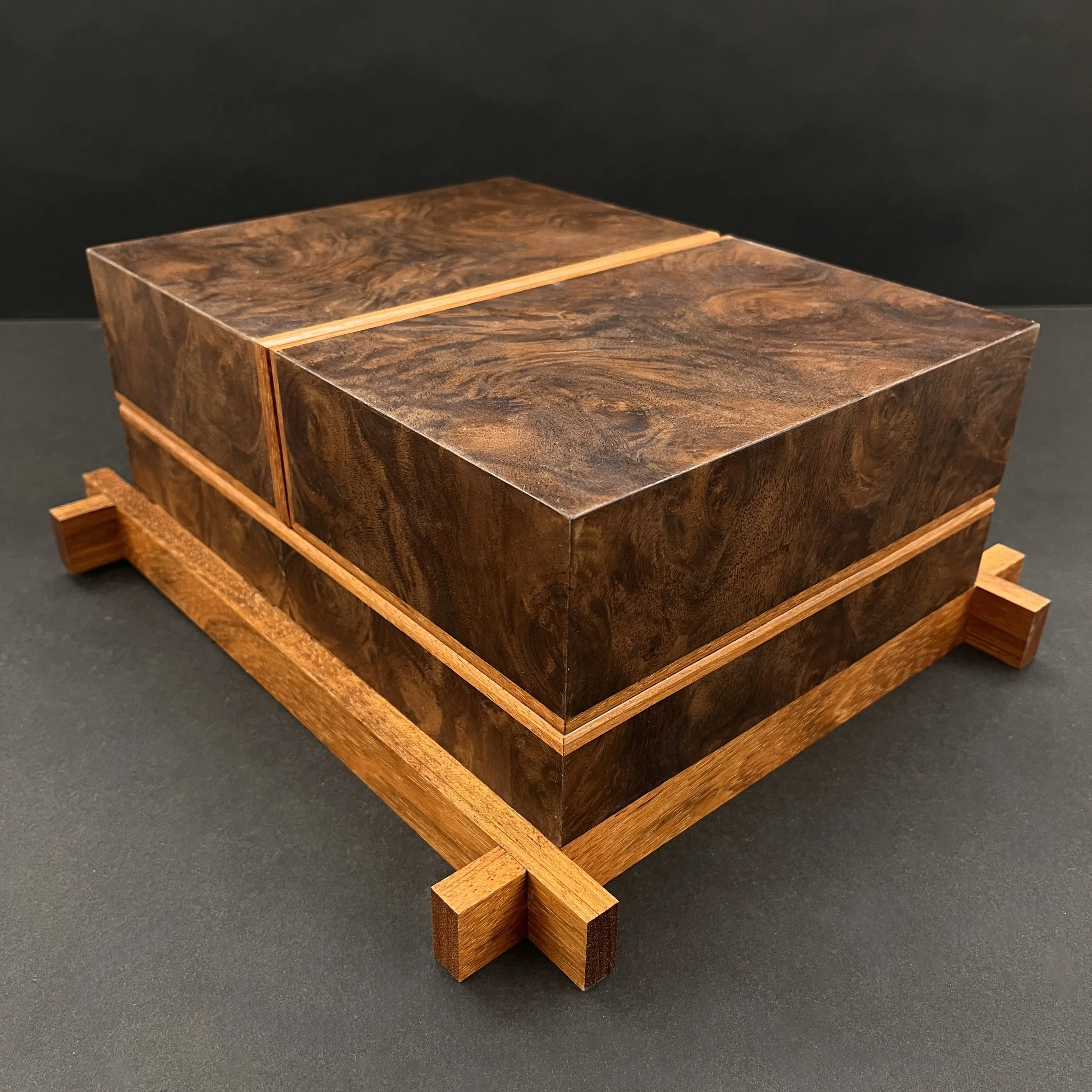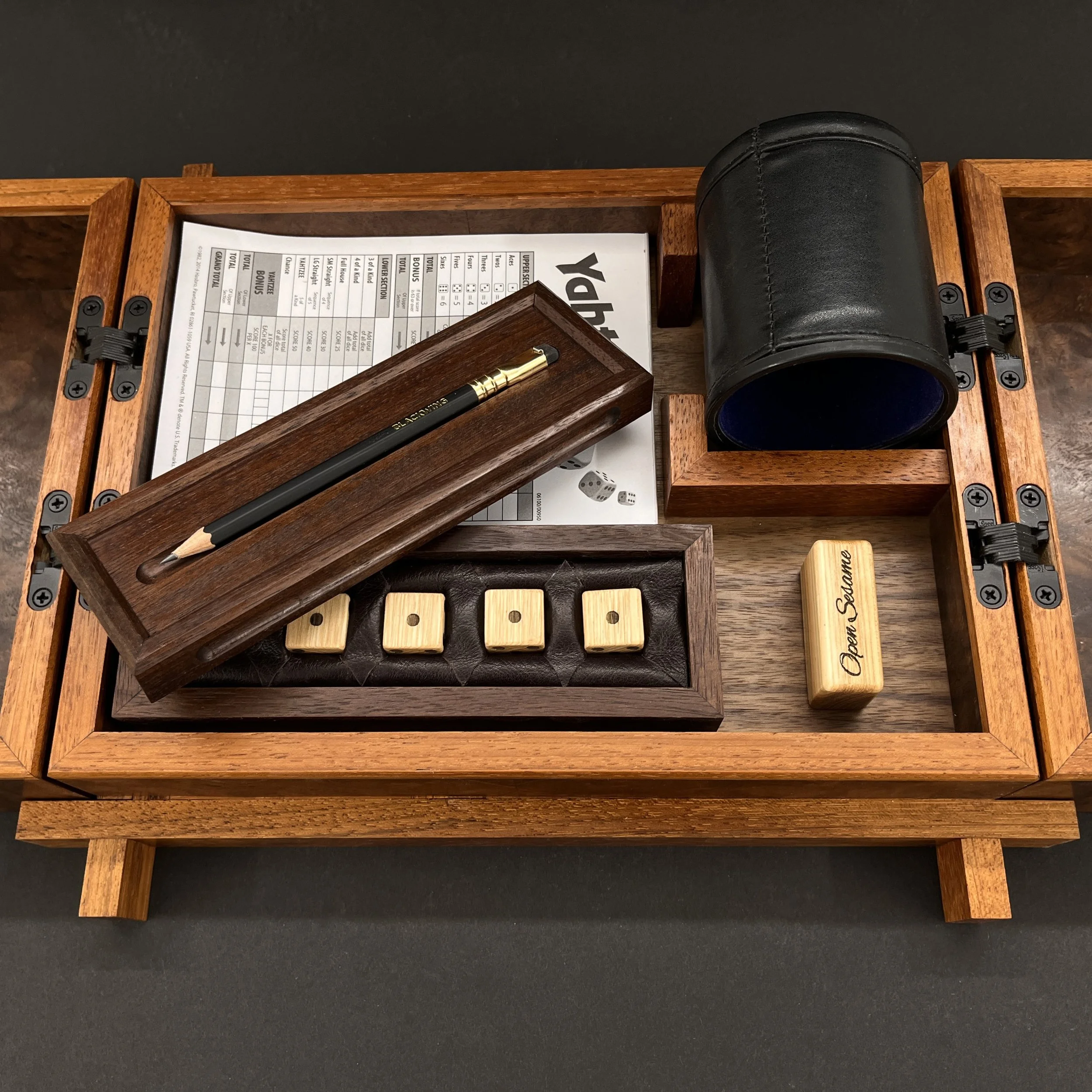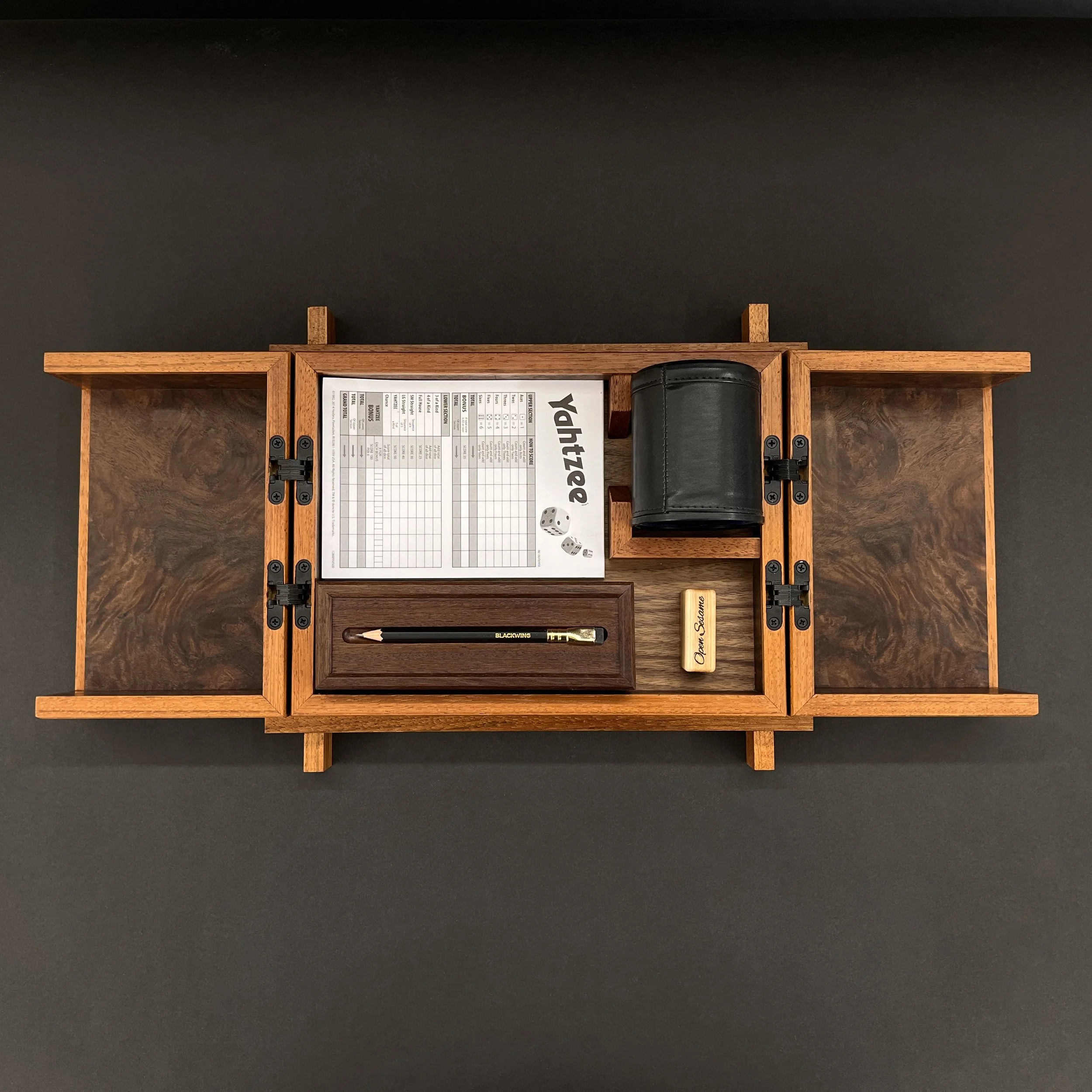 Inspired by the families love of the games, this Yahtzee Phase Ten game box was created to add value to each game night experience. crafted with Jatoba, peruvian walnut, hickory, walnut burl, and kangaroo leather. The sharp lines, earthen tones, and eye catching grain create a HEIRLOOM piece that is sure to spark conversation whenever guest arrive.